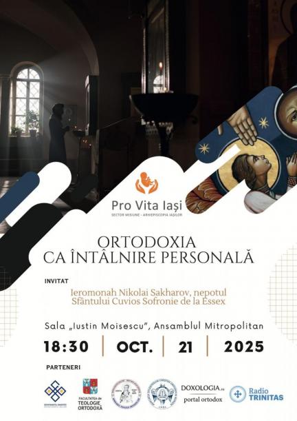 Departamentul Pro Vita din cadrul Sectorului de Misiune al Arhiepiscopiei Iașilor organizează, în această zi, de la ora 18:30, la Sala „Iustin Moisescu” din Ansamblul Mitropolitan Iași, conferința „Ortodoxia ca întâlnire personală”. Invitatul evenimentului este părintele Nikolai Sakharov, nepot al Sfântului Sofronie Saharov, doctor în teologie la Universitatea Oxford și ieromonah la Mănăstirea Sfântul Ioan Botezătorul din Essex, Marea Britanie. Mărturia părintelui Sakharov, întemeiată pe moștenirea duhovnicească a Sfântului Sofronie, va oferi publicului ieșean o perspectivă profundă asupra credinței ca experiență personală și cale de întâlnire cu Dumnezeu.